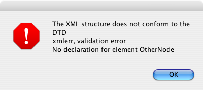 This time around, we didn't have to fiddle with the Java classpath, as the XML Validation API is built-in. However, we had to write the XML and Schema to temporary files, to avoid length limitations in the shell command. If we now make a deliberate mistake, say change one of the 'LeafNode' elements into a 'BeafNode' element, we see this error: